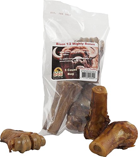 -. Feature : Great Dog Mighty 1/2 Bison Bones, sold in 3 count bags, are approximately 3.5-5" long, 2-3" wide and sourced from free range grazing Bison raised exclusively on native grasses on small Midwest family farms making them ideal for dogs with beef allergies or other food sensitivities / Mighty 1/2 Bison Bones come from the lower front or rear Bison leg bone which carries the majority of a Bison's weight making the bones extremely strong and dense--hence the name "Mighty" / Great Dog 1/2 Mighty Bones are very clean making them great for inside or outside enjoyment and uniquely suited for heavy chewers, for example, Bullies, Frenchies, or any mixed breed heavy chewer / Loaded with all natural flavor, Great Dog Mighty 1/2 Bison Bones bring long-lasting chewing enjoyment / Mighty 1/2 Bison Bones are slow roasted in their own juices at a Great Dog human grade facility free from smokes, soaks and other additives