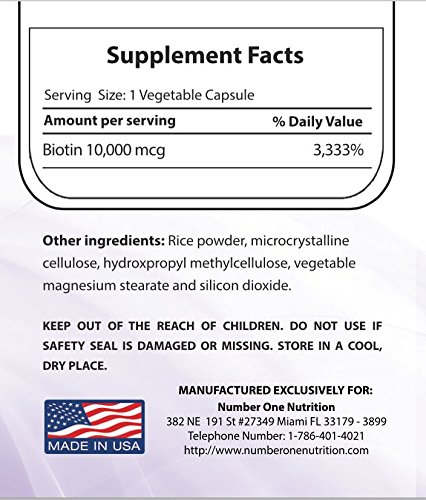 -. Binding : Health and Beauty -. Brand : Number One Nutrition -. Feature : Biotin 10000mcg is great for men and women looking for hair growth or damaged hair. / Vitamin b complex treatment fights hair loss and provide essentials to promote skin health. / B7 supplements is safe for extensions. / Dull and brittle nail because of nail polish can benefit from capsules. / Made in the USA at an FDA approved manufacturing facility. Orders yours today! -. Label : Number One Nutrition -. Manufacturer : Number One Nutrition -. ProductGroup : Health and Beauty -. ProductTypeName : HEALTH_PERSONAL_CARE -. Publisher : Number One Nutrition -. Studio : Number One Nutrition -. Title : Number One Nutrition Biotin 10000mcg, 60 count