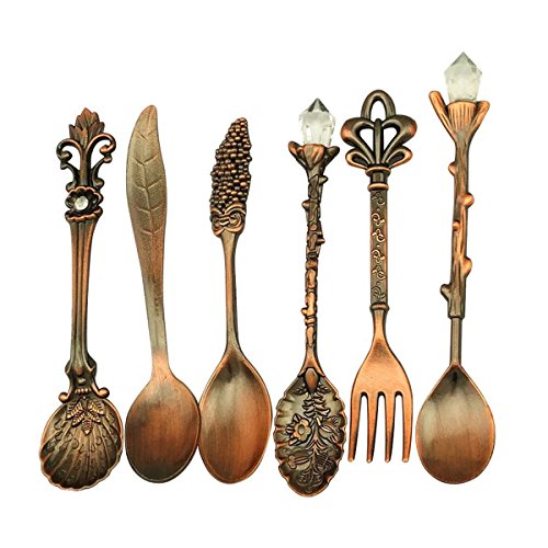haoun Coffee Spoon Teaspoon Kitchen Dining Bar Nostalgic Vintage Royal Style Metal Carved Coffee Spoons and Fork for Sweet Snacks - Red Antique Brass