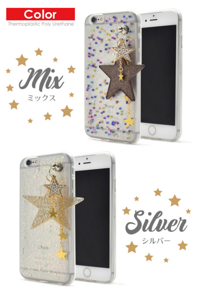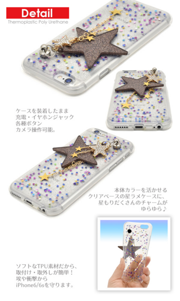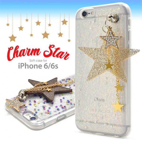星をちりばめたラメケースに、大小さまざまな星のチャームが可愛いiPhone6/6s用ソフトケース!