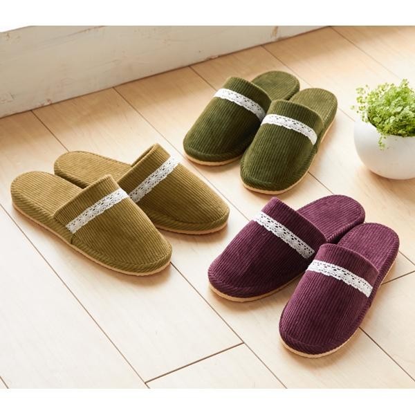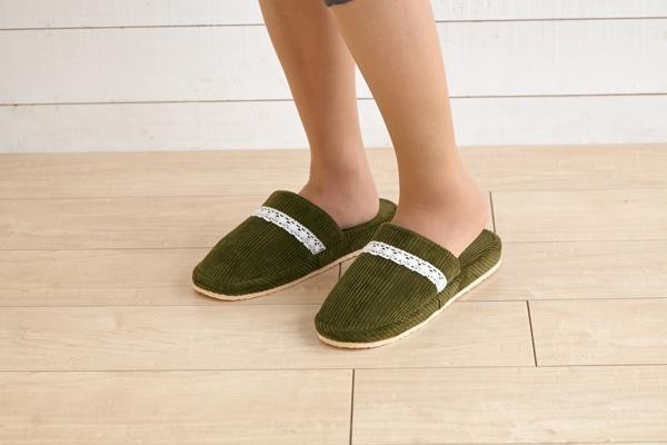 かっこいいイメージのコーデュロイに、レースがアクセントになっているスリッパです。