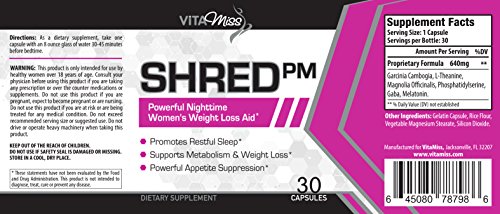 Nighttime Advanced Weight Loss Diet Pill – Vitamiss’s Shred PM is a critical component to any successful diet and fitness plan. Targets fat and lipid metabolism, lowers fat absorption, and controls cortisol levels while sleeping. Specially formulated to fight the middle of the night cravings associated with dieting, suppresses appetite and helps you sleep!