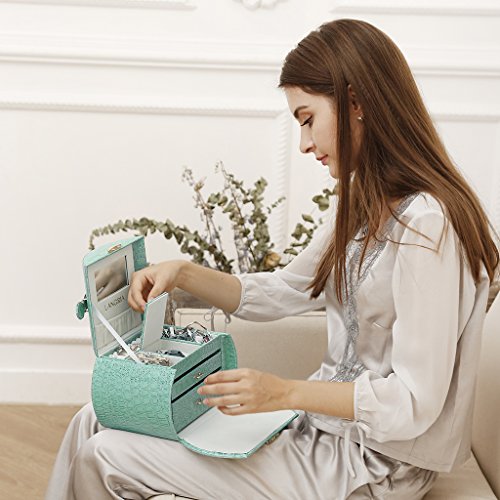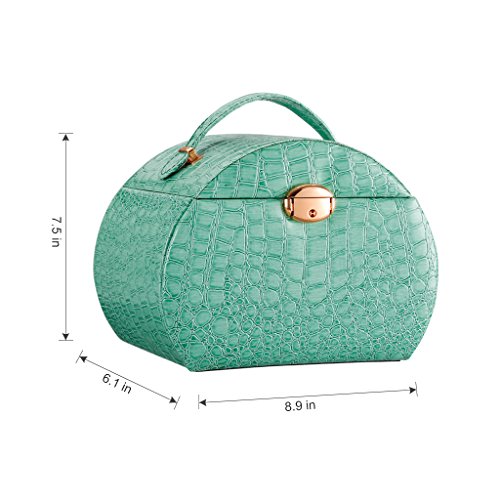 Lockable system for an extra of security This LANGRIA Arched Crocodile Grain Leather Jewelry Box Lockable Makeup Storage Case Organizer comes with one electroplated golden metal lock with key for security, to keep your favourite pieces of jewelry well-protected, organized and easy to find. The handle on the top and the interior mirror, along with the light weight, make this case a compact and portable box to easily carry with you during your trips.