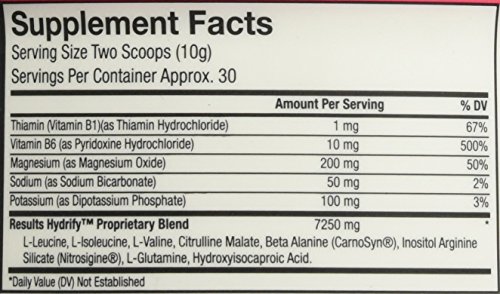 ReleaseDate : 2015-12-12 Studio : Results Nutrition Publisher : Results Nutrition Binding : Health and Beauty Product Description Its time to set your goals and find some products that will help you achieve them. Get the results you need with hydrify bcaa intra-workout in fruit punch. Contains breakthrough ingredients that help increase muscle, enhance recovery, increase cell volume, replace the electrolytes lost during exercise and boost Nitric Oxide levels for skin-splitting pumps. Advanced intra-workout provides optimum fuel to increase workout intensity and promote muscle growth. What's in the label is inside every serving of Results Nutrition products. 0