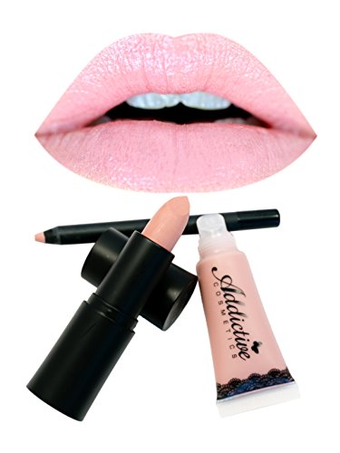 Nude Pink Lipstick, Lipliner and Lip Gloss Set by Addictive Cosmetics- All Natural Organic Lipstick, Liner and Lip Gloss Set- Vegan Friendly and...
