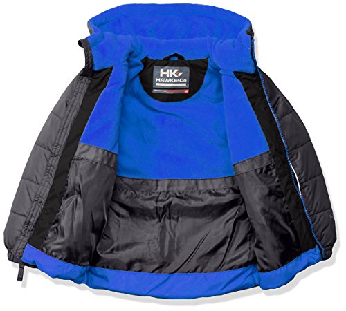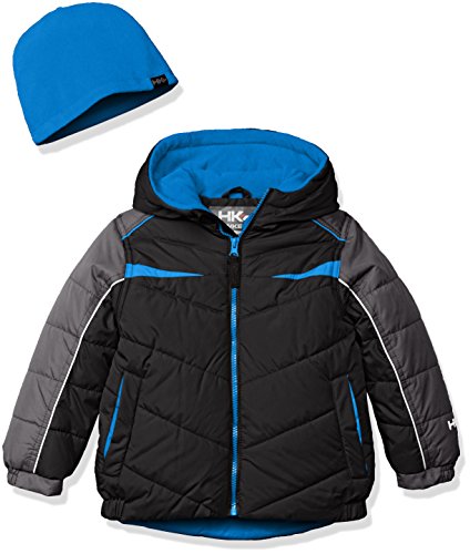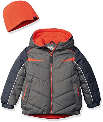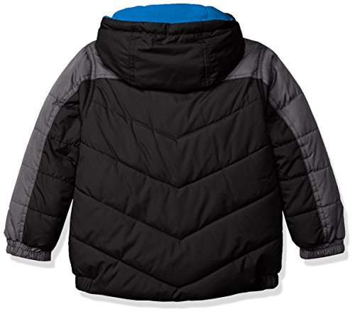 Puffer coat with contrast pieced insert and fleece lined hood.
