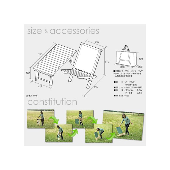 특징:부속 캐리 백에,테이블1대와 우드 라인 라운지《―》가 2대,수납에 옵니다.