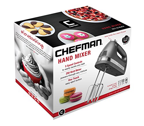 THE CHEFMAN RJ17-V2 SERIES TURBO HAND MIXER With an impressive 250W motor powering five speeds plus a turbo button, this ultimate kitchen appliance provides you with the power and control to take on a wide range of mixing tasks with ease.