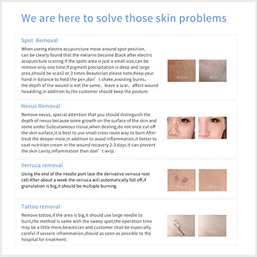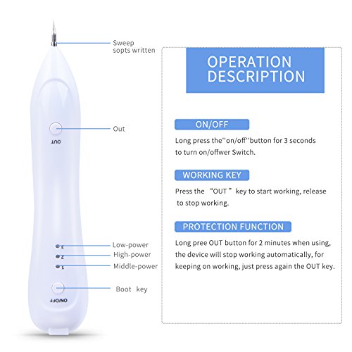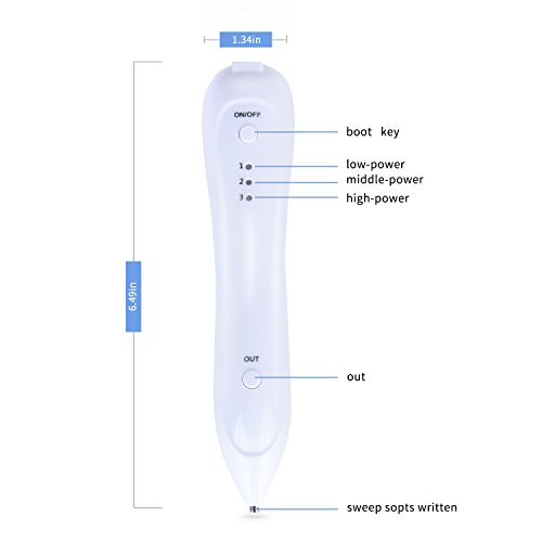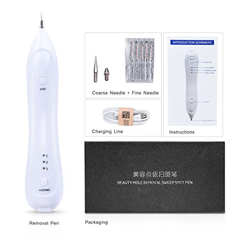 -. Feature : Unique electric ion technology beauty device: Which make the item removing spots without hurting the normal skin, no bleeding and little pain. / 3-level setting mole removal kit:Lower level is used on spot and freckle. Strong level is usred on mole and skin tags. / Replaceable Needles Professional mole removal device: It comes with 5 fine needles and 1 coarse needle. perfect for tattoo spot freckle fleshy nevus pigment. / USB Charging mole removal pen: This item built-in Polymer lithium battery,it comes with USB cable,easy to charge. / 100% money back if you not satisfied our item, please use the item as the instructions.