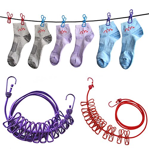 BoomYou 2 Pack Travel Elastic Clothesline Flexible Laundry Line Portable Windproof Clothesline Retractable Airer with 12pcs Clothespins for Outdoor and Indoor ( Purple and Red )