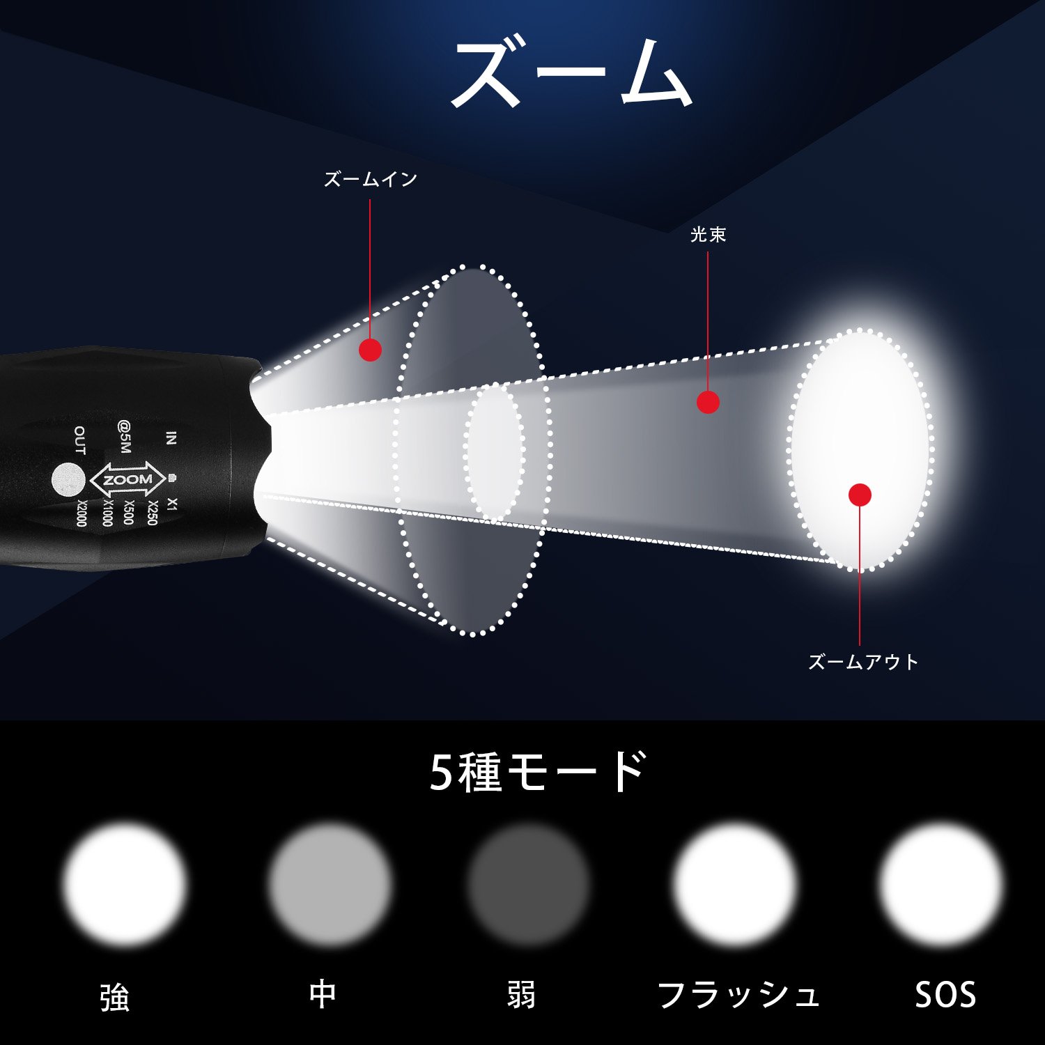 Mode: strong, medium, weak, flash, SOS