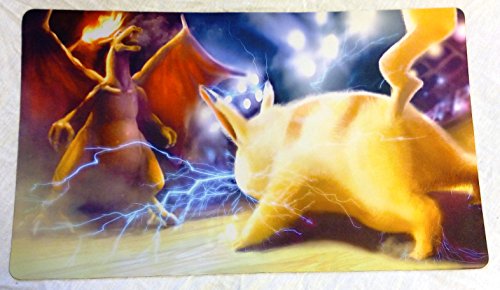 -. Title : Pikachu Vs. Charizard Pokemon TCG playmat, gamemat 24" wide 14" tall for trading card game smooth cloth surface rubber base