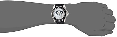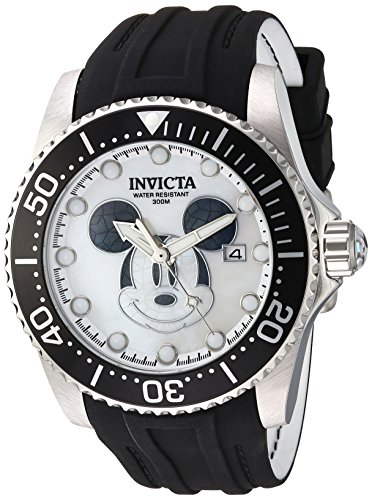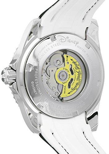 Invicta 22748 Disney Limited Edition men's automatic dive watch features a 47mm wide and 16mm thick solid stainless steel case with a unidirectional rotating black accented silver tone bezel and textured screw down crown. Invicta 22748 is powered by a precise Japanese TMI NH35A automatic movement with 24 jewels. This stylish watch also features a Mickey mouse printed white mother of pearl dial with white accents silver tone luminous hands and dot hour markers along with the date display function, scratch resistant mineral crystal and water resistant to 300 meters. Invicta 22748 is equipped with a 26mm wide black silicone strap with a buckle clasp. Invicta 22748 men's Disney Limited Edition MOP dial black silicone strap automatic dive watch is brand new and comes in an original Invicta gift box and is backed by a 5 year limited warranty.Feature