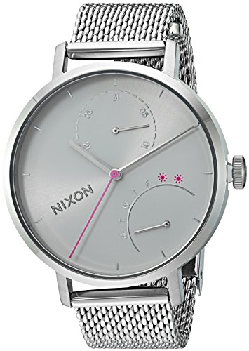 Your style will always make a splash if you are wearing Nixon's Clutch All Silver-Tone Stainless Steel Watch. The clean, simple lines of the 38mm stainless steel case are brilliantly contrasted with the intricate details found on the dial. The dial boasts silver tone, printed markings, a date subdial at 12 o'clock, and a day subdial at 4'clock. Reminding you that there is always time to play, the bright purple seconds hand and Saturday and Sunday day markers do not go unnoticed. Completing the design is a stainless steel Milanese bracelet that comfortably secures to your wrist with a stainless steel locking clasp.Feature