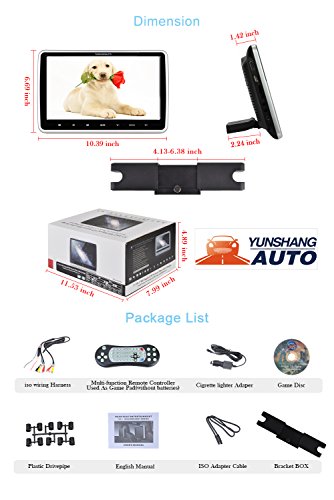 -. Binding : Electronics -. Brand : YUNSHANGAUTO -. Color : black -. Feature : 10.1 inch touchscreen Pixel 1024*600,Technological sense design. / DVD region: Compatible with DVD/VCD/MP4/RMVB/CD-R/CD-RW/SVCD/DIVX. / Built-in 2.0 USB port/SD/MMC card slot/IR/FM/Speaker, and Built-in 32 bits wireless games Function, with Game Disc. / Easy to install in car or at home, the installationtime is within five minutes. / You can buy two headrest DVD to achieve thesameeffect screen display. -. Label : Yunshangauto -. Manufacturer : Yunshangauto -. PackageQuantity : 1 -. ProductGroup : CE -. ProductTypeName : CONSUMER_ELECTRONICS -. Publisher : Yunshangauto -. Studio : Yunshangauto -. Title : Headrest DVD Player Yunshangauto 10.1 Inch Touch Screen Universal Car Monitor with Remote Control and IR Headphone