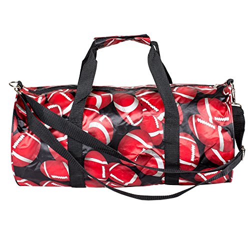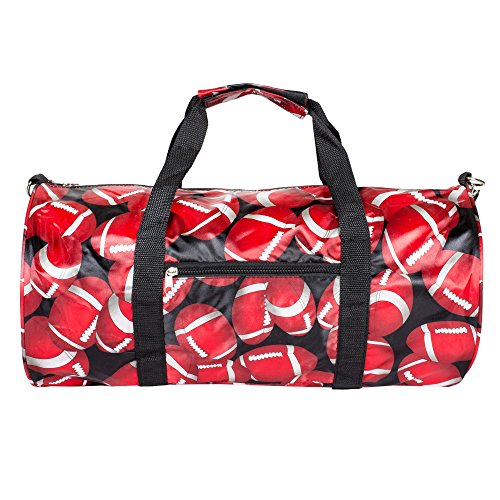Product Description Fun travel or gym bag perfect for working out or going on a trip! 19 inches across, 10 inch diameter. Includes handles and shoulder strap that adjusts from 24 to 42 inches long. Front zipper pocket, 0