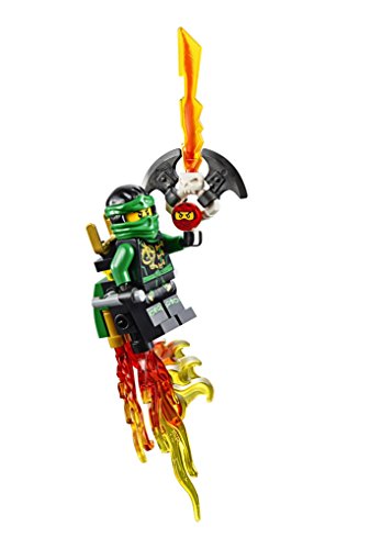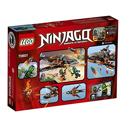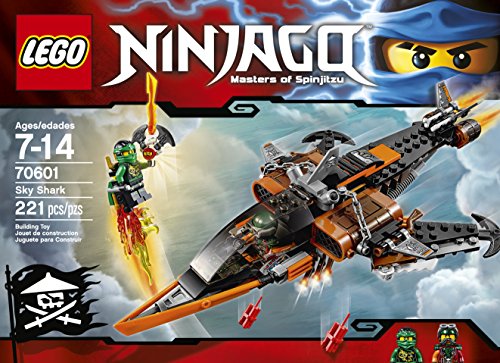 - Feature : The Sky Shark features an opening cockpit with detailed dashboard stickers, a dropping function (to drop 2 dynamite or 2 rotten fish elements), 2 fold-out blades, plus a hidden pirate sword and 6 detachable guns / Weapons include a translucent red Djinn Blade with 'trapped' Kai' element and Lloyd's golden weapon staff / Includes 2 minifigures: Lloyd and Flintlock / Sky Shark measures over 2" (6cm) high, 10" (27cm) long and 6" (16cm) wide / Drone/jetpack measures over 3" (9cm) high and 1" (5cm) wide and under 1" (2cm) deep