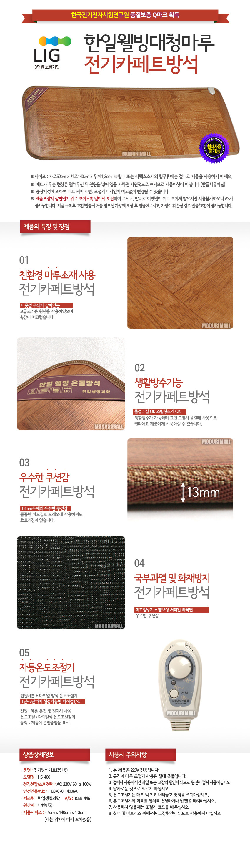 <상품명 : 한일 웰빙대청마루 3인 전기방석(140×50)>