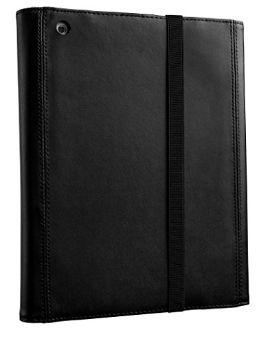 The protective iPad case has elastic corner loops that grip your iPad or tablet to hold it in place, a rear porthole for camera, and a elastic band closure.