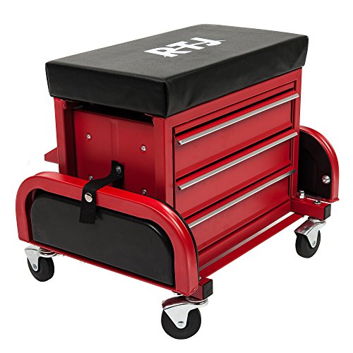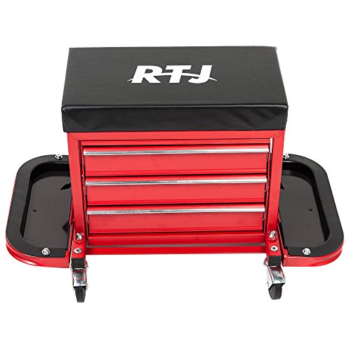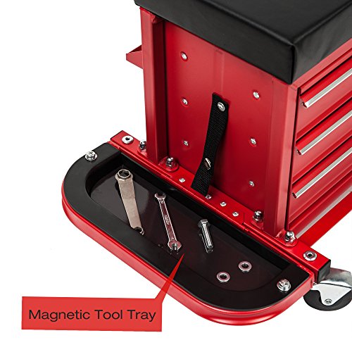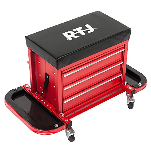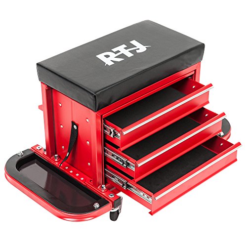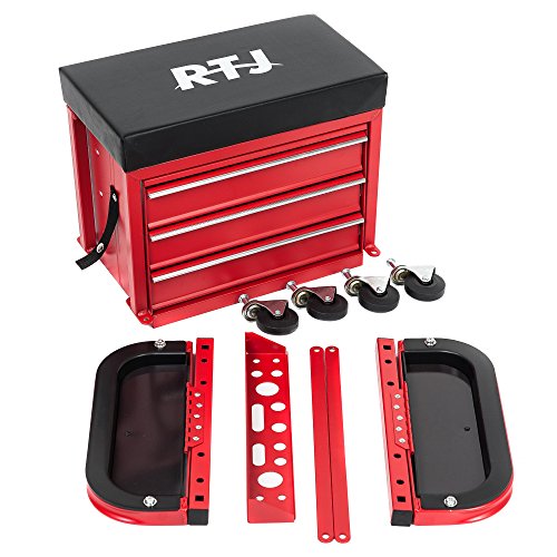 RTJ Tool Chest Cabinet Roller Seat with 3 Drawers & 2 Trays and Pry Bar, Black and Red
