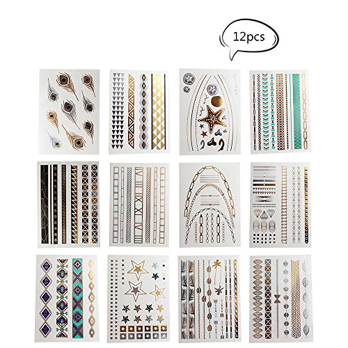 Teenitor 12 Sheets Metallic Shimmer Jewelry Tattoo, Gold/Silver Flash Metallic Tattoos, 230+ Designs Temp Tattoos - Stars, Diamonds, Feathers Bracelets,...