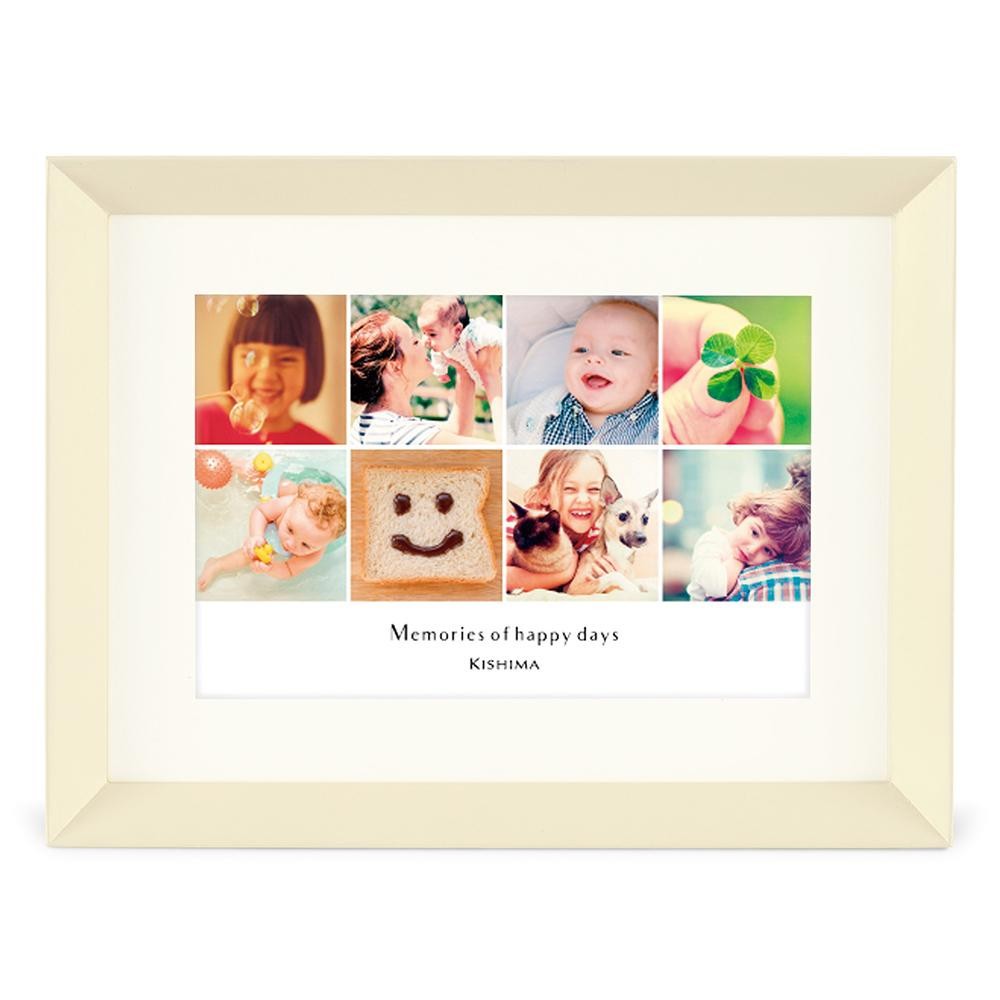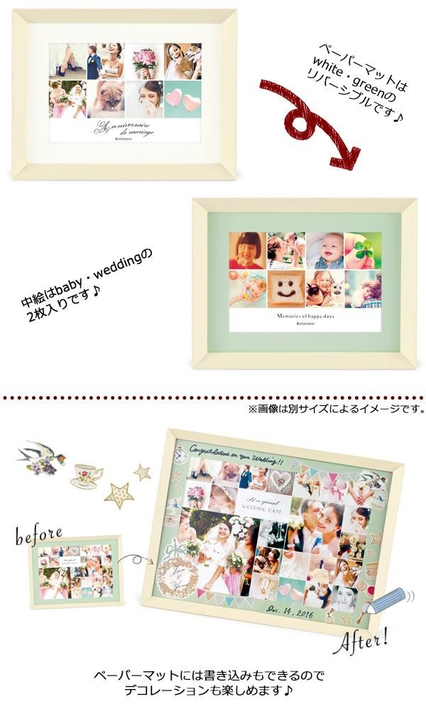 | スマートフォンなどの写真を、アプリや写真屋さんで手軽にランダムに配置して印刷できるサービスに最適なフォトフレーム。細かな写真をたくさん並べても邪魔せずそっと引き立ててくれるスッキリとしたデザインが魅力です。天然木を使用した上質な雰囲気に加え、リバーシブルのペーパーマットには書き込みもできるので、寄せ書きやデコレーションを施して贈り物にするのもオススメです。 |