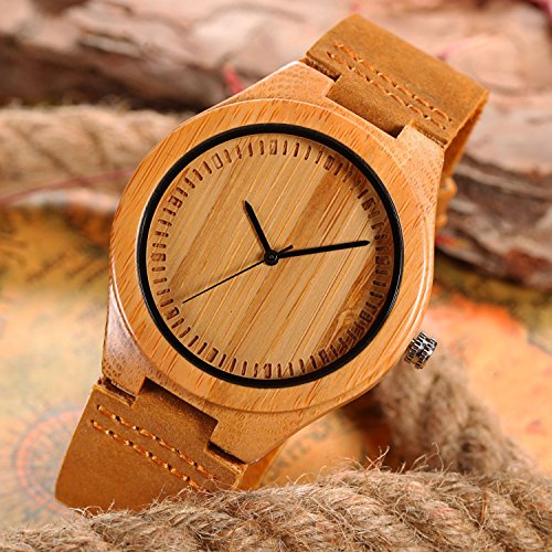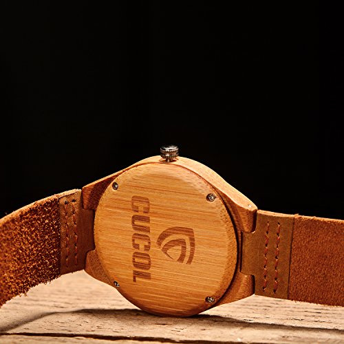 -. Title : CUCOL Natural Bamboo Wooden Watch with Genuine Brown Leather Strap Japanese Quartz Movement Casual Watches