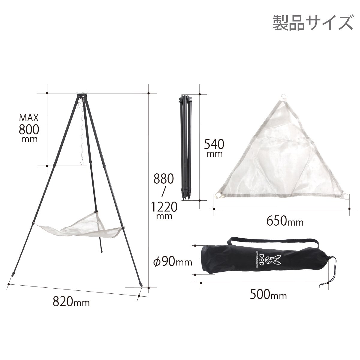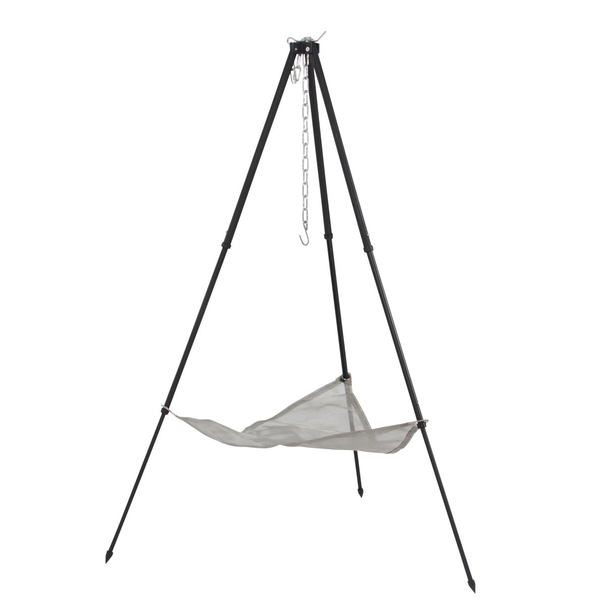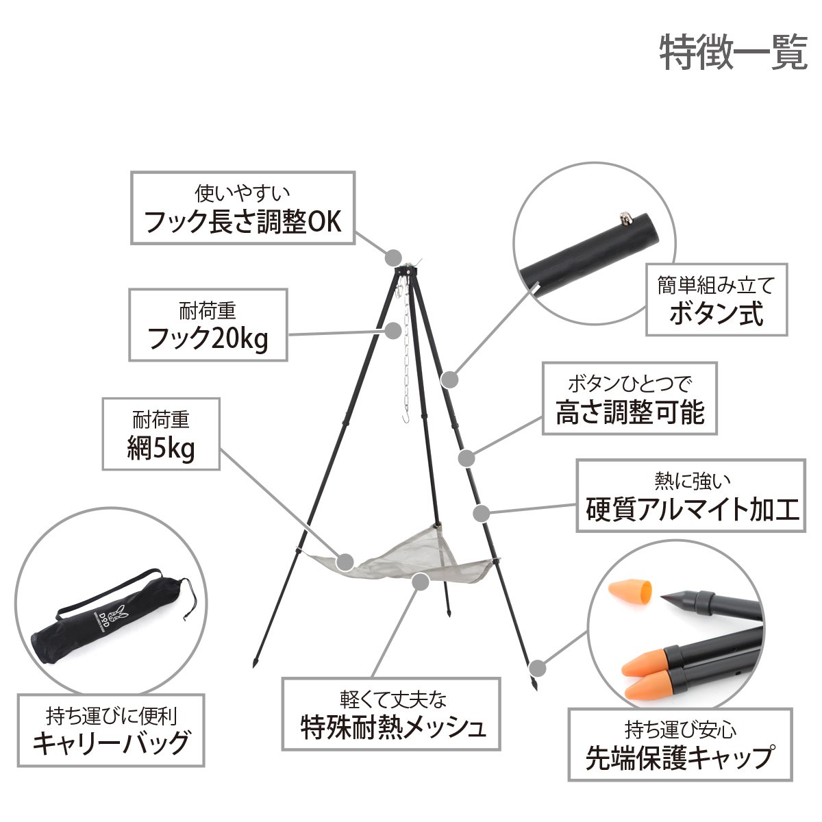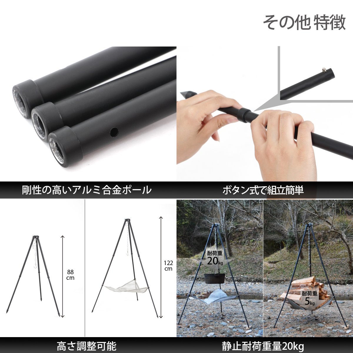It adopts an aluminum alloy pole that has both lightness and strength, and the hook of a bonfire tripod is designed to withstand up to 20 kg and the net up to 5 kg.