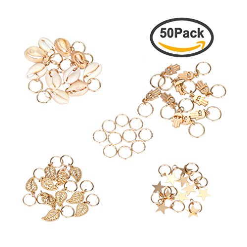 Amariver 50Pcs Gold Ring Shell Hands Leaves Stars Pendant Rings Set Hair Clip Headband Hair Accessories Headpiece for Women Girls, 4 Styles, Pack of 50