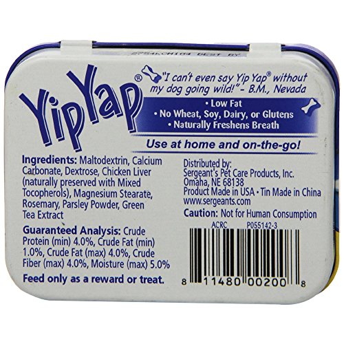 -. Feature : 1 Pack / All-natural breath fresheners for dogs from Yip Yap / Natural breath freshening ingredients include: green tea, parsley, and rosemary; cooked liver entices hesitant pups / Breath fresheners come in fun, bone shapes / Aluminum tin for convenient travel; each pack weighs 1.4 ounces