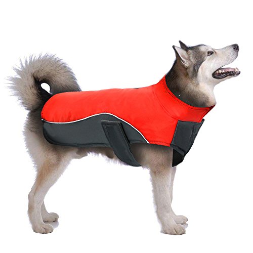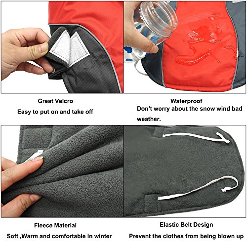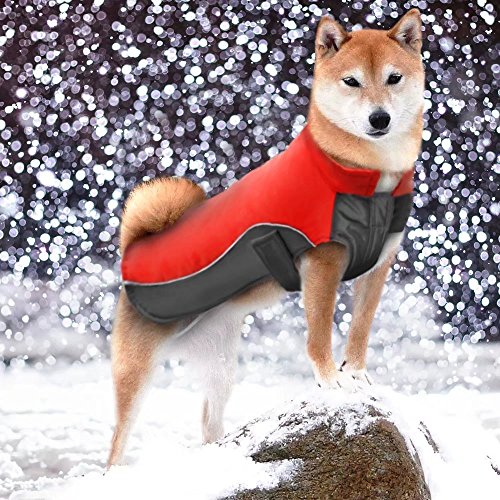-. Feature : ★WATERPROOF AND WARM---Outside with waterproof, windproof and snowproof durable oxford material, inside layer is polar fleece which touches soft and keeps warm well, can meet your various needs in inclement weather, for instance,especially good for outdoor walking and playing. To dress decently when in festive holiday, you can choose this stylish apparel for your friend which is applicable to Christmas. / ★NOTE SIZE CHOR---The size chart is confirmed by years of size experience and fit for most dog breeds, please measure your dog's exact chest girth, back length and leave 1-2 inch more, then compare to the size chart to find the most suitable one for your dog. / ★REFLECTIVE KEEP SAFE---The reflective line along with the back stitching line is showy in dark environment, helps keep your dog safe during walking,jogging and running with your puppy in the early morning or at night, we would advise your dog to put on visible clothes to keep safe from danger, and there is a slit on the back compatible with leash for control. / ★STYLISH EASY TO WEAR -- Designed with light colors, looks attractive,With velcro beneath the chest and neck make it very easy to put on and take off, don't have to lift dog's foot. / ★MACHINE WASHABLE, EASY TO STORE---You can treat it as a common coat, just throw it into washing machine when it's dirty, just store it like any other clothes.