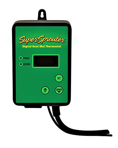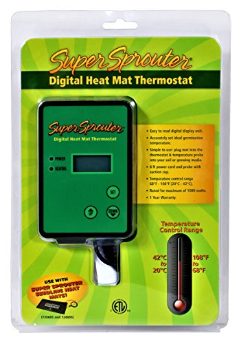 The Super Sprouter Digital Heat Mat Thermostat is easy to use. Simply plug the heat mat into the thermostat and place the temperature probe in desired location. The temperature control range is 68 Degree F - 108 Degree F (20 Degree C - 42 Degree C). Temperature is easily viewed through the back lit digital display, allowing you to accurately set ideal germinating or rooting temperatures. Maximum current rating is 8.3 amps/1000 watts. 6 ft. power cord and probe with suction cup.Feature