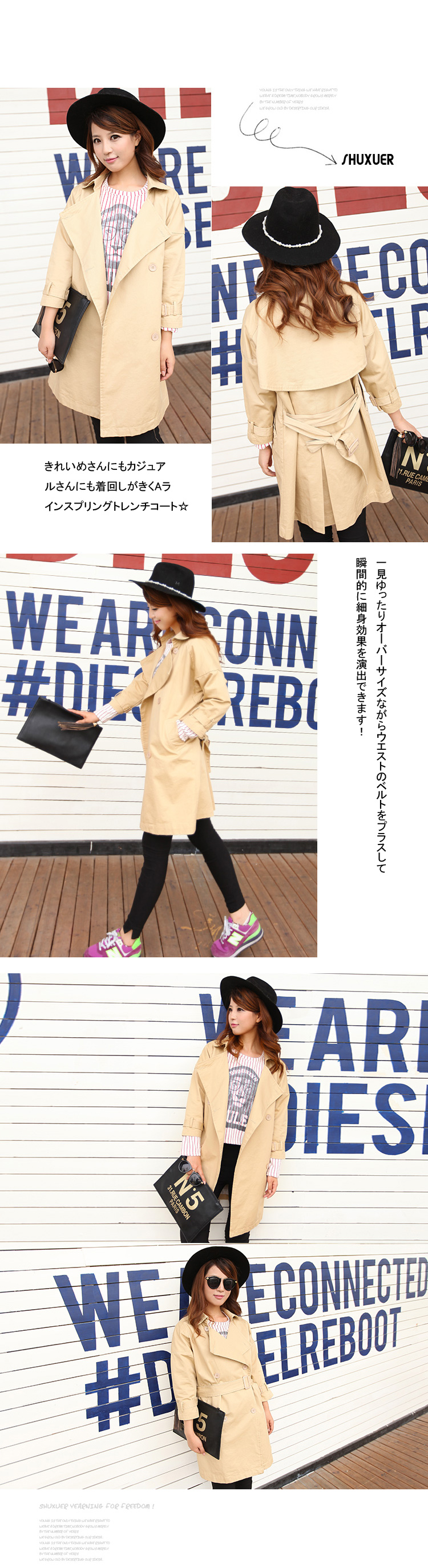 | きれいめさんにもカジュアルさんにも着回しがきくAラインスプリングトレンチコート☆一見ゆったりオーバーサイズながらウエストのベルトをプラスして瞬間的に細身効果を演出できます!スキニーと合わせると、裾広がりのトレンチからのぞくシルエットで足細効果まで得られちゃうのが嬉しいです。ストライプ柄の裏地は付いて、春先から秋口まで長いシーズンで着用して頂けます? | |