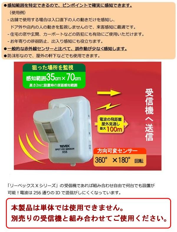 | Xシリーズ全受信機に対応した、人感センサー送信機です!!感知範囲が狭く、ピンポイントで感知できます。介護や防犯、来客時に最適。本体埋込マグネット付。ご使用には別売の受信機が必要です。 |