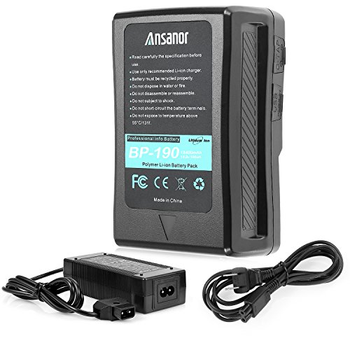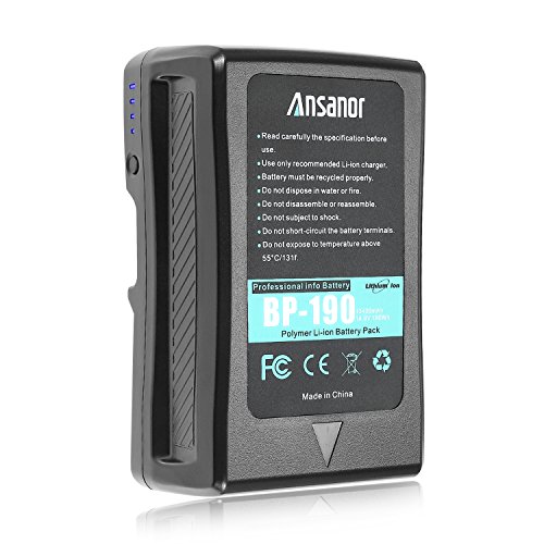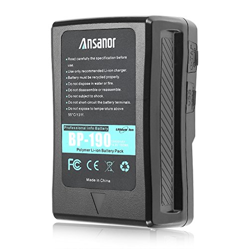 The super huge capacity V-Mount battery 190Wh 13400mAh/14.8V. lightweight V-Mount battery for professional Sony camcorders. Independent 5V/2.1A USB output, available to charge smart-phone,etc.The battery also comes with a wall plug for self-charging so no extra charger is needed.4-level LED indicator on the side to show remaining power. Thanks for your purchase! Specification: Voltage: 14.8V Color: Black Cells :Polymer Lithium-ion Capacity: 13400mAh 190Wh 14.8V Compatible with Sony Camcorder: DSR-250/300/370K2/570WSL/600P EX250/330/350 S270 PMW-EX330K/330L 580K/580L F5 F55 F23 F35 F3K F3L TD300 680/700/850 HDW-F900R 800P 680 PDW-700/850 DVM-7/70/707P/709WSP/790WSP/90/90WS BVP-5/50/550W/7/70/90-BVV5 BVW-200/300/400/400A/505/507/550/570/590/D600 and More V mounted devices Compatible with Sony BP batteries: BP-L60A BP-IL75 BP-L40A BP-800S BP-130L BP-GL95 BP-GL65 BP-L60S BP-140A BP-L90A BP-FL75 BP-L80S and other V mount batteries. Package Include: 1 x V-mount Battery 1 x Adapter Charger 1 x DC- D-tap Output Cable How to know our battery is fully charged: Method 1: four led lndicator lamps on the side of our battery are on and not flash. Method 2: the indicator lamp on our adaptor charger is blue. 0
