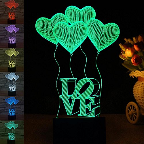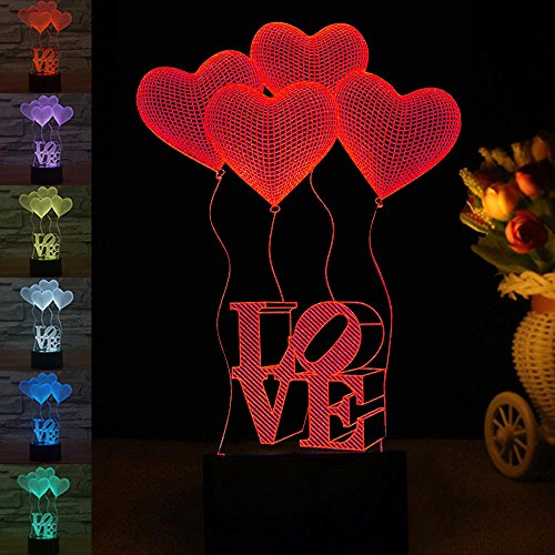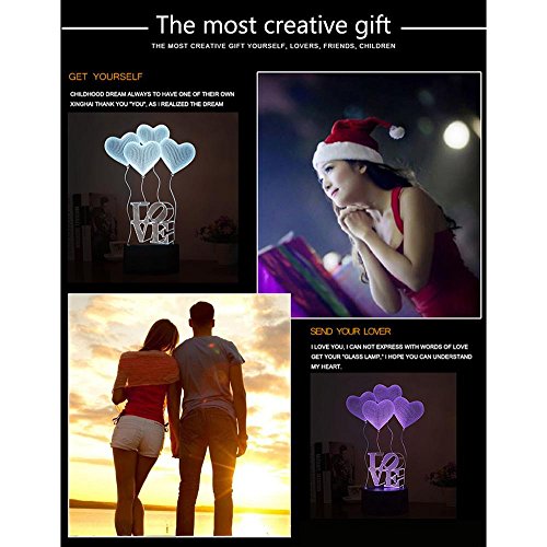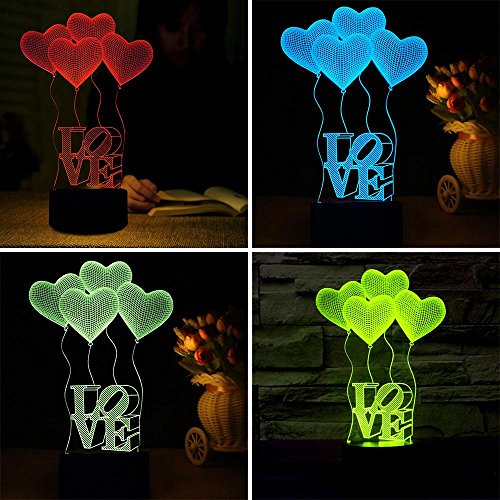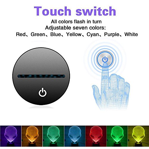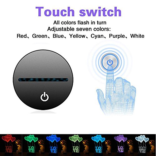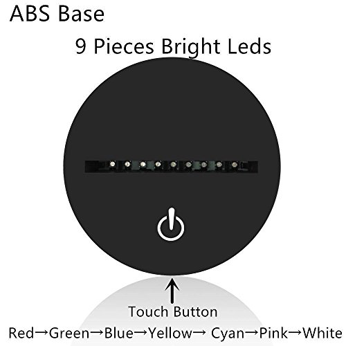 -. Feature : ★【CREATIVE 3D LAMP】---3D visual Effect, has a nice hologram effect. And the 3D effect is much better in the dark / ★【8 MODES】---7 color single light and 1 gradual changing light, changing the modes by touching the button / ★【BOTH BATTERY OPERATED AND PLUGGED IN】---Both battery operated and plugged in could light the lamp, so it is so convenient, you could take it and use it anywhere as you like / ★【ECO-FRIENDLY】---0.5W, 2700-3000K, 100,000 hours lifespan, LED beads source, with 1.2m USB cable, without any harmful substances to eyes, safe, durable and environmental protection / ★【UNIQUE GIFT】---Great Gift for Christmas, birthday. Nice decoration for child room, bedroom, living room, wedding, cafe, restaurant and party. 100% satisfaction guarantee