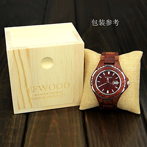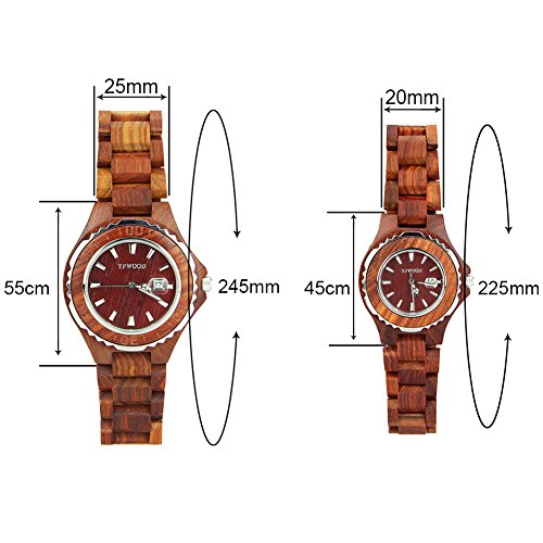 YF-WOOD 페어 워치 손목시계 커플 맨즈+레이디스 YFWOOD 목제 천연목 밴드에 자연을 느끼는 나무의 온기를 살린 손목시계 우드 시계 유니섹스 3기압 방수 날짜 표시 (적단커브루)