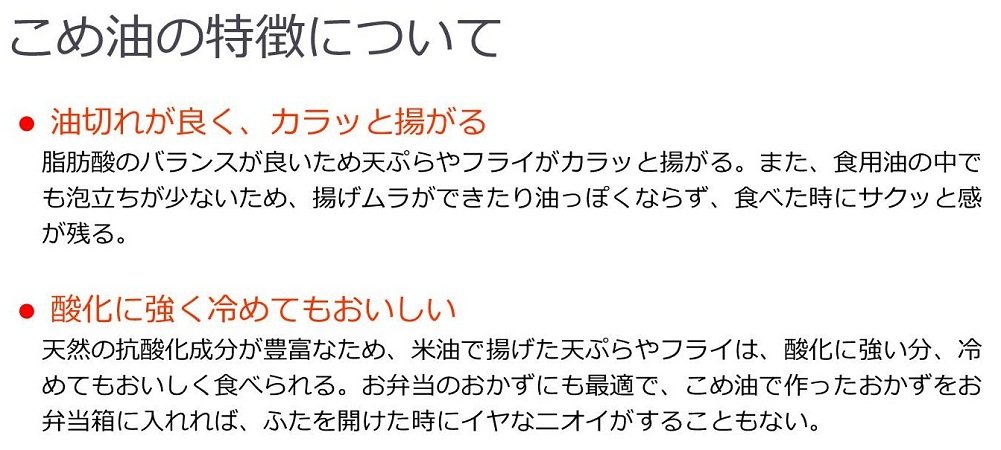 The oil sickness substance (acrolein) generated by heating the oil is fewer than other edible oils, and you can cook comfortably