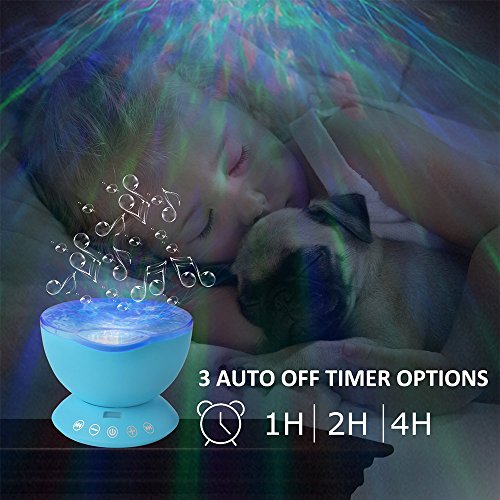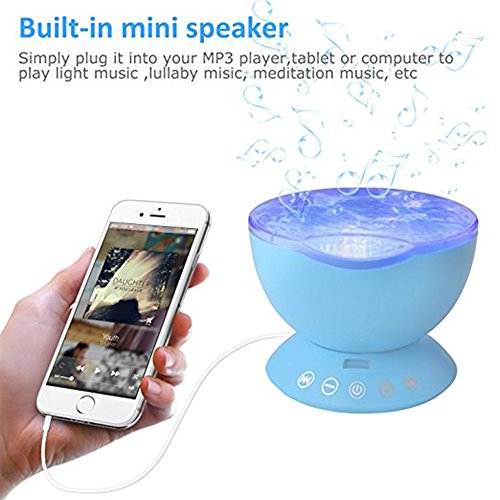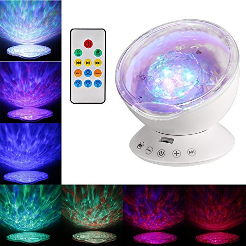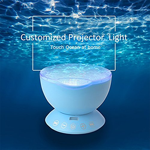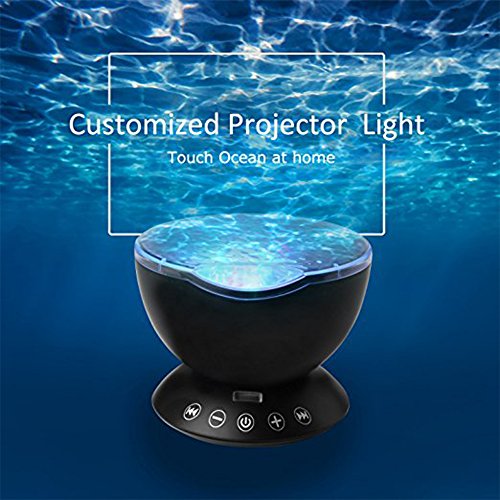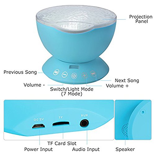 -. Feature : The inside of the screen is wavy, externally smooth, through the light refraction and transforms in light projection out of the color of the screen that ocean wave flows, create an enjoyable and relaxing bedtime experience for children, soothe and comfort kids to sleep,creating a romantic atmosphere for the living room or bedroom. / Seven kinds of projection mode can be free to switch, comes with a remote control can remotely control the ocean projector(2*AAA battery not included), with bulid-in music player.It can also be connected to the phone or computer to play music. / It has a built-in TF memory card(Not included) and timer function. The projection screen can be set to dynamic otherwise static. The product can also turn off the projection function which can be as a sound. / Using 12 high-grade ultra-bright LED lamp beads, you can tilt the angle, wider projection area, access to a wide panoramic effect, more clear, long life. / And there are four built-in lullaby music: forest insect sounds, ocean wave sea gulls sounds, flowing water birds sounds and merry nature sounds.
