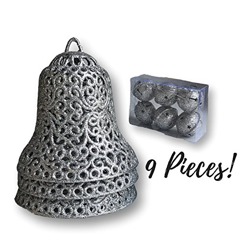 - HOLIDAY BELL SET. Set of 9 large silver glittered bell ornaments. 3 big bells and 6 small jingle bells. These are perfect to add to your Christmas garland or door wreath.