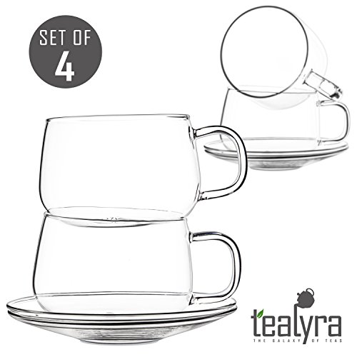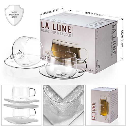 -. Brand : Tealyra -. Feature : A perfect way to enjoy your cup of gourmet tea or coffee / Highly transparent quality glassware - dishwasher safe; lightweight yet durable / Easy to match to your decor because its clear glass construction is both so versatile and so appealing / Capacity: 10.1 fl oz / 300ml -. Label : Tealyra -. Manufacturer : Tealyra -. ProductGroup : Kitchen -. ProductTypeName : KITCHEN -. Publisher : Tealyra -. Studio : Tealyra -. Title : Tealyra - La Lune - 10.1-ounce - Clear and Lightweight Glass Tea and Coffee Cup with Saucer - 300ml