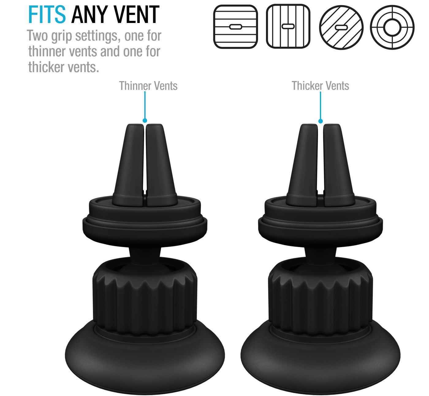 2. The vent mount has two grip settings, one for thicker vents and one for thinner vents.<br>