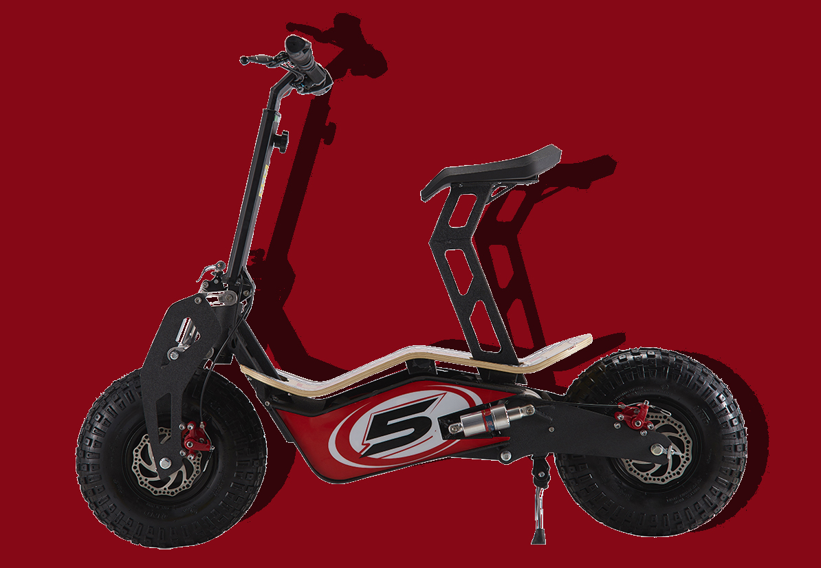 The MAD certainly has style and personality. It’s also highly customizable, offering five individual motor options between 500 and 1600 watts, along with lead-acid and lithium-ion battery options. Range is between 19 and 25 miles (30 and 40 km) with the 48V/12Ah lead-acid battery, rising up to around 35 miles (56 km) with the lithium option. Speed tops out at 28 mph (45 km/h) on the 1300- and 1600-watt versions. Front/rear disc brakes bring the high-tensile steel-framed, 97- to 106-lb (44- to 48-kg, depending on spec) scooter to a stop.