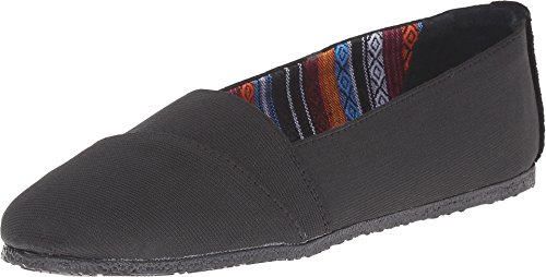 The Eva features flexible A-line style with colorful patterened fabric lining, a cushioned insole, and a lightweight clover rubber sole.