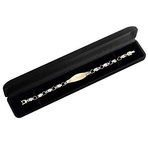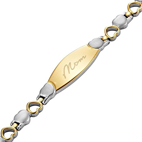 From our Mom Collection, we hope to help put smiles on mother's faces around the world. This is a perfect way to do so. The engraved 'MOM' features a love heart in place of the 'O', truly showing your love. For an extra personal feel, the MOM has a hand writing effect. The two-tone color complements the bracelet and will be a great addition to a wardrobe, suitable for many situations. The love heart design of the bracelet expresses love for your mother by the love hearts linking up. Whether it is a birthday, mother's day, Christmas, or you just want to say thanks for being a good mom, this bracelet is sure to please. Titanium is a really light, but really strong metal, making it perfect for jewelry as it feels as if you aren't wearing it! Every other heart in the bracelet is fitted with a strong 3000 Gauss magnet. We understand as a gift, presentation is key, so we include our Willis Judd gift. We also understand that everyone's wrist size is different and it can be hard to buy jewelry online. We include a free, easy-to-use tool that will enable you to remove and add links as needed straight from home. What's more, we have a no-quibble, money-back return policy. Hypoallergenic, this stylish bracelet will not irritate skin. However, please note that as this bracelet contains magnets, it is not suitable for pacemaker users.Feature