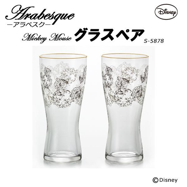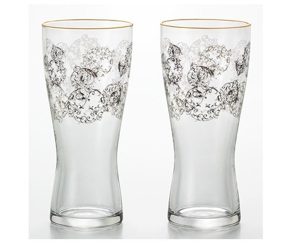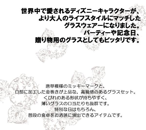 唐草模様のミッキーマークと口部の金巻き加工が上品なグラスセット!!くびれのある形状が持ちやすく、薄いグラスの口当たりも抜群です。特別な日はもちろん、普段の食卓をおしゃれに演出できるアイテムです。 |