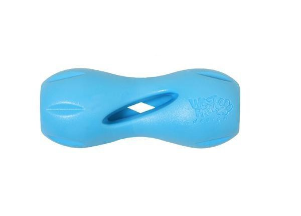 柔らかい素材ながらも頑丈でよく弾み、水にも浮きます。ジャーキーなど細長いおやつを入れるのに便利な横長タイプで、中央が窪んでおり咥えやすさも抜群。内側に施されたギザギザ突起(ティーストラップ)が中に入れたおやつを取り出しにくくして、飽きさせずに長時間遊ばせることができます。 |