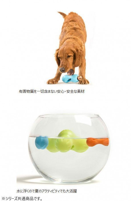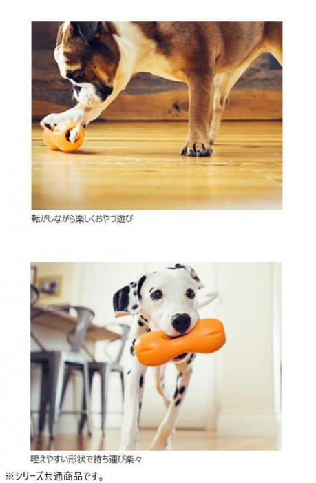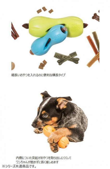 | 柔らかい素材ながらも頑丈でよく弾み、水にも浮きます。ジャーキーなど細長いおやつを入れるのに便利な横長タイプで、中央が窪んでおり咥えやすさも抜群。内側に施されたギザギザ突起(ティーストラップ)が中に入れたおやつを取り出しにくくして、飽きさせずに長時間遊ばせることができます。 |