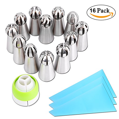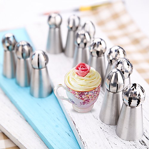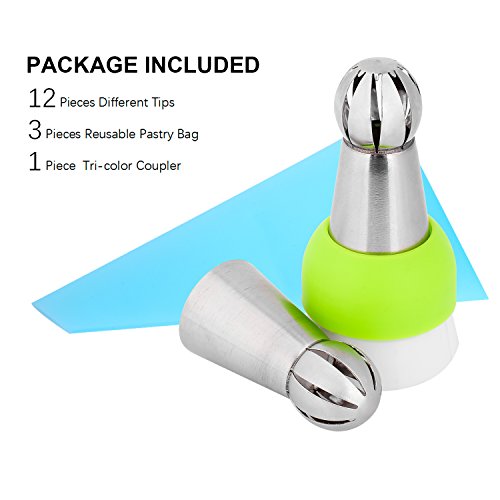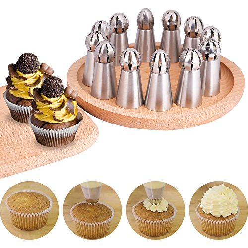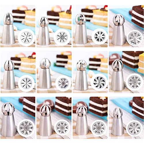 Russian Ball Tips, PROMENE Russian Sphere Ball Icing Tips Nozzles Cake Decorating Supplies Cookies Macaron Cupcake Decorating Tips Kits with 3 Reusable Silicone Pastry Bag (12 Sets)