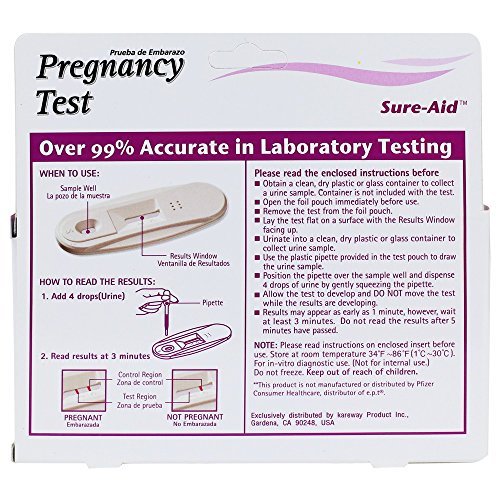 -. Binding : Health and Beauty -. Brand : Sure Aid -. Feature : Over 99% accurate in laboratory testing / Simple one step / Easy-to-read results / Test any time of day / 1 tester (2 Pack) -. IsAdultProduct : 0 -. Label : Kareway -. Manufacturer : Kareway -. MPN : 0007-Sureaid-Pregnancy Test Fast Result -. PackageQuantity : 2 -. PartNumber : 0007-Sureaid-Pregnancy Test Fast Result -. ProductGroup : Health and Beauty -. ProductTypeName : HEALTH_PERSONAL_CARE -. Publisher : Kareway -. Studio : Kareway -. Title : Sure-Aid Pregnancy Test - Fast Result (2 Pack)